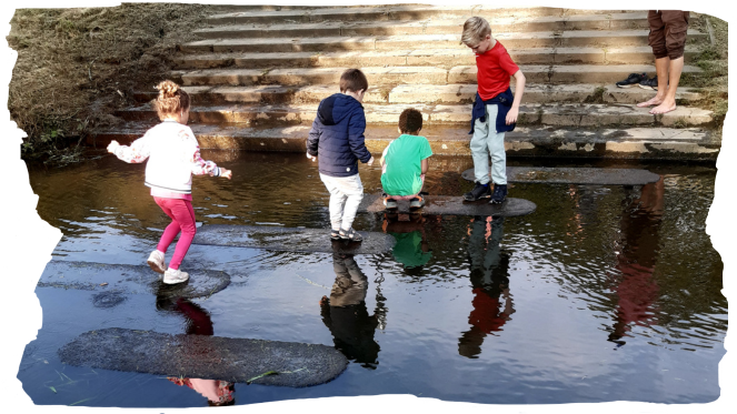 Als we met de bakfiets op pad gaan naar 'de Stapstenen' in de Slangenbeek, begint het avontuur al. Deze plek is perfect om de natuur op een speelse manier te beleven. De beek wordt hier doorkruist door grote stenen, door de kinderen 'de Stapstenen' genoemd, waar je voorzichtig overheen kunt stappen. Maar pas op! Als het flink heeft geregend, verdwijnen de stenen onder water en wordt het een uitdaging om droog aan de overkant te komen. Een misstap zorgt vaak voor natte voeten en een natte broek – en natuurlijk veel gelach! Zelfs als ze boven water liggen, blijven de stenen glad door algen, wat het oversteken extra spannend maakt.