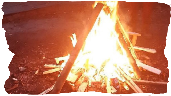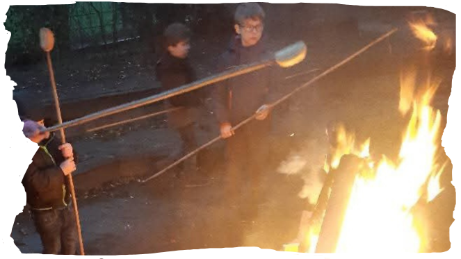 Wanneer we genoeg verzameld hebben, bouwen we ons Paasvuur stap voor stap op, waarbij de kinderen helpen met opbouwen. Als het vuur brand, hoort er natuurlijk iets lekkers bij! We roosteren marshmallows, bakken broodjes en maken zelfs verse popcorn boven het vuur! Het geluid van ploffende maïskorrels maakt het extra feestelijk.