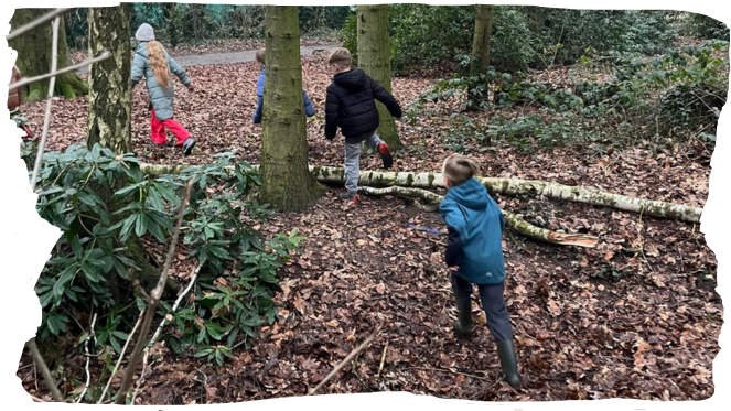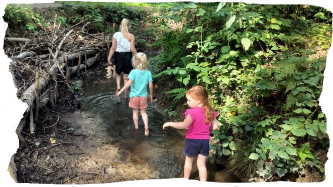 Het Weusthagbos, vlak naast onze locatie, is een echte ontdekkingsplek voor de kinderen. Hier is altijd wat te doen! We leggen takken over de sloot om er overheen te kunnen lopen zonder natte voeten te krijgen. Bij mooi weer trekken we onze schoenen uit en lopen door het water met blote voeten – een avontuur op zich!