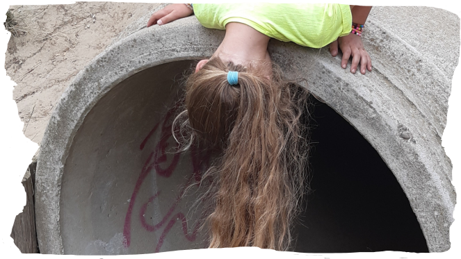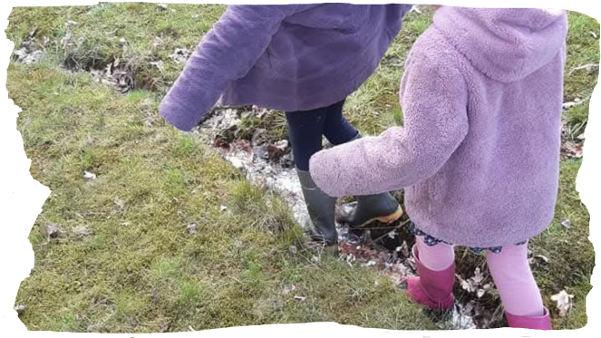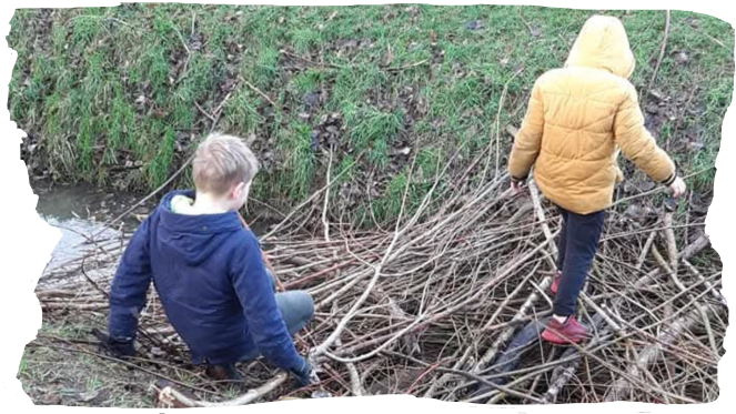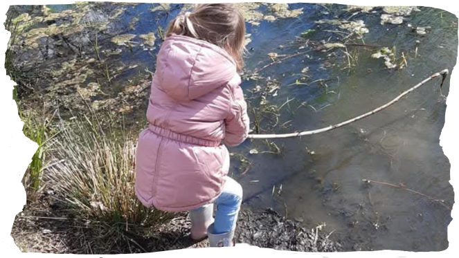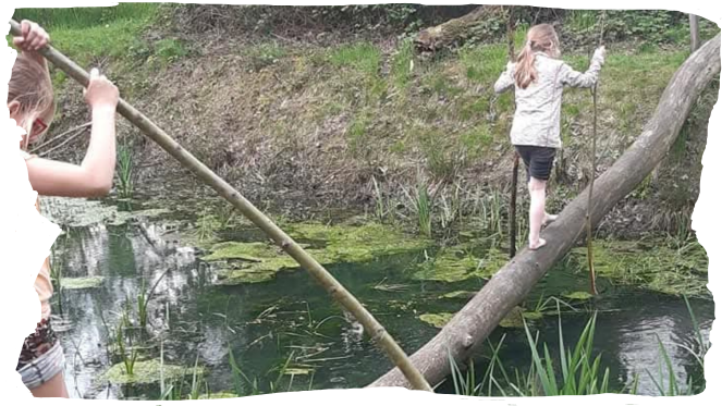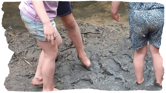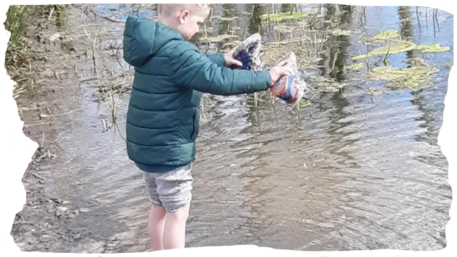Bij het strandje kunnen ze heerlijk pootjebaden in de ondiepe plas, een breder stuk van de sloot waar het water rustig stroomt. Aan de modderige oever vinden ze klei waarmee ze van alles maken, van kleine poppetjes tot ware kunstwerken.