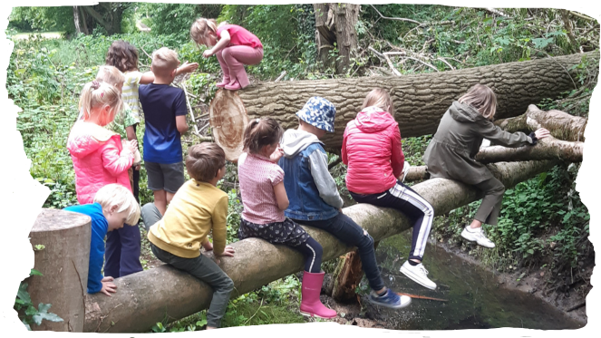 Het Beleefbos, grenzend aan het Weusthagbos, is dé plek waar kinderen zich helemaal kunnen uitleven. Hier bouwen ze hun eigen hutten van wilgentakken of balanceren over de stepping stones om droog de sloot over te steken. Voor de echte durfals ligt er een grote boomstam over een plas: wie haalt de overkant zonder nat te worden? Soms glijdt er toch iemand af en eindigt tot z’n middel in het water – dat hoort er gewoon bij!